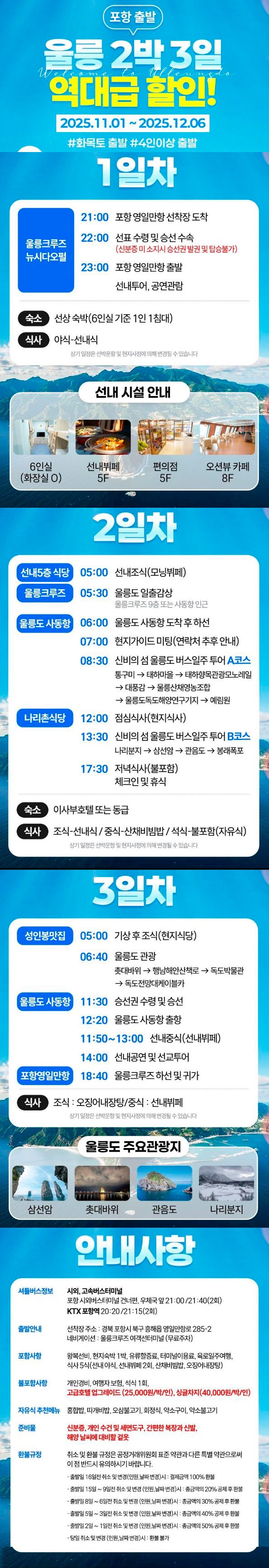 | 여행코스 | 포항역-영일만 여객터미널-크루즈탑승-울릉도-포항 |