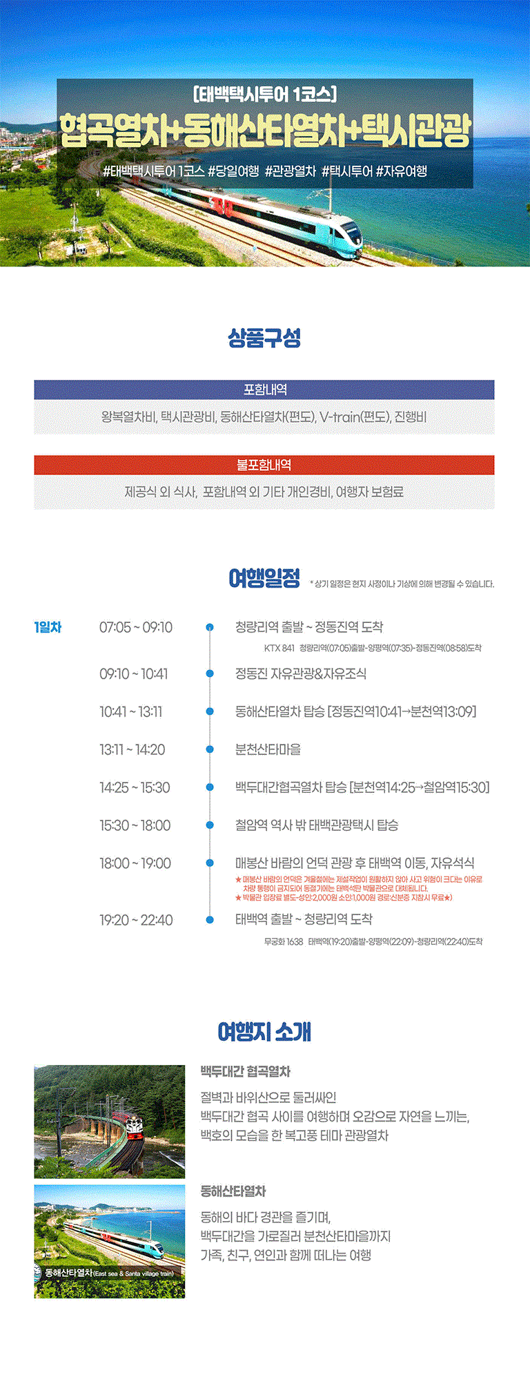 | 여행코스 | 청량리역-정동진역-동해산타열차-분천역-백두대간협곡열차-철암역-매봉산 바람의언덕-태백역-청량리역 |