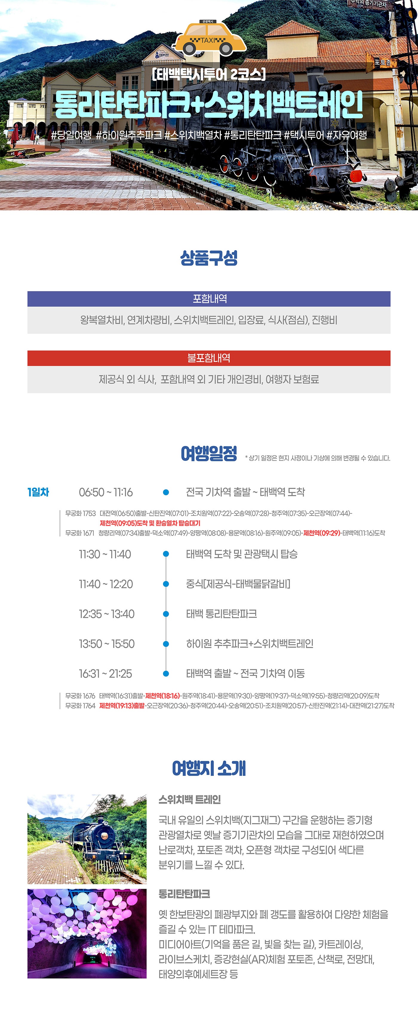 | 여행코스 | 태백역-중식-태백통리탄탄파크-스위치백트레인-태백역 |