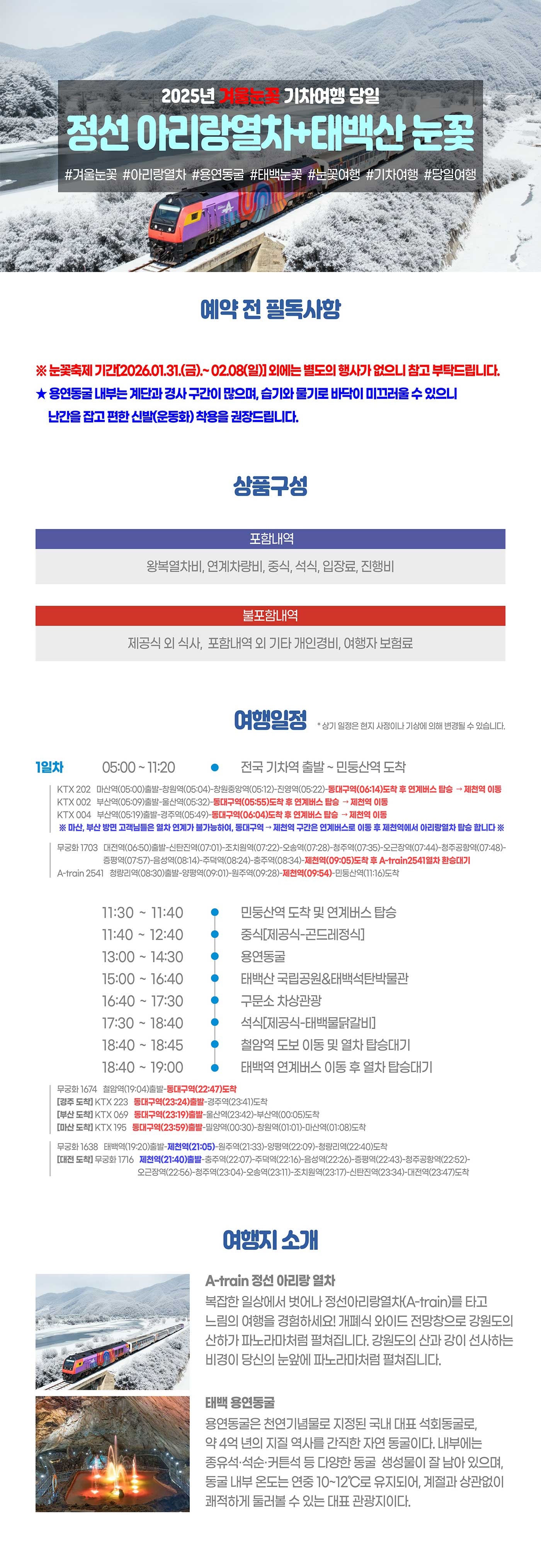 | 여행코스 | 민둥산역-용연동굴-태백산 국립공원-구문소-철암역or태백역 |