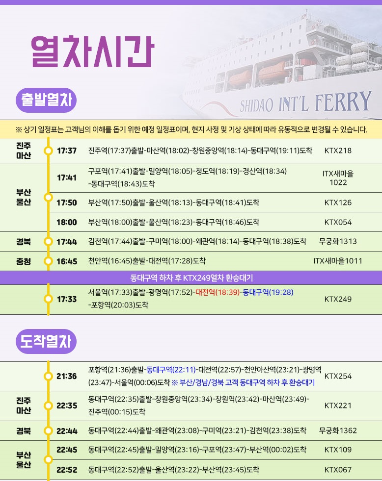상기 일정은 열차나 천재지변 또는 현지 사정 및 도로교통 상황에 따라 변동될 수 있습니다.