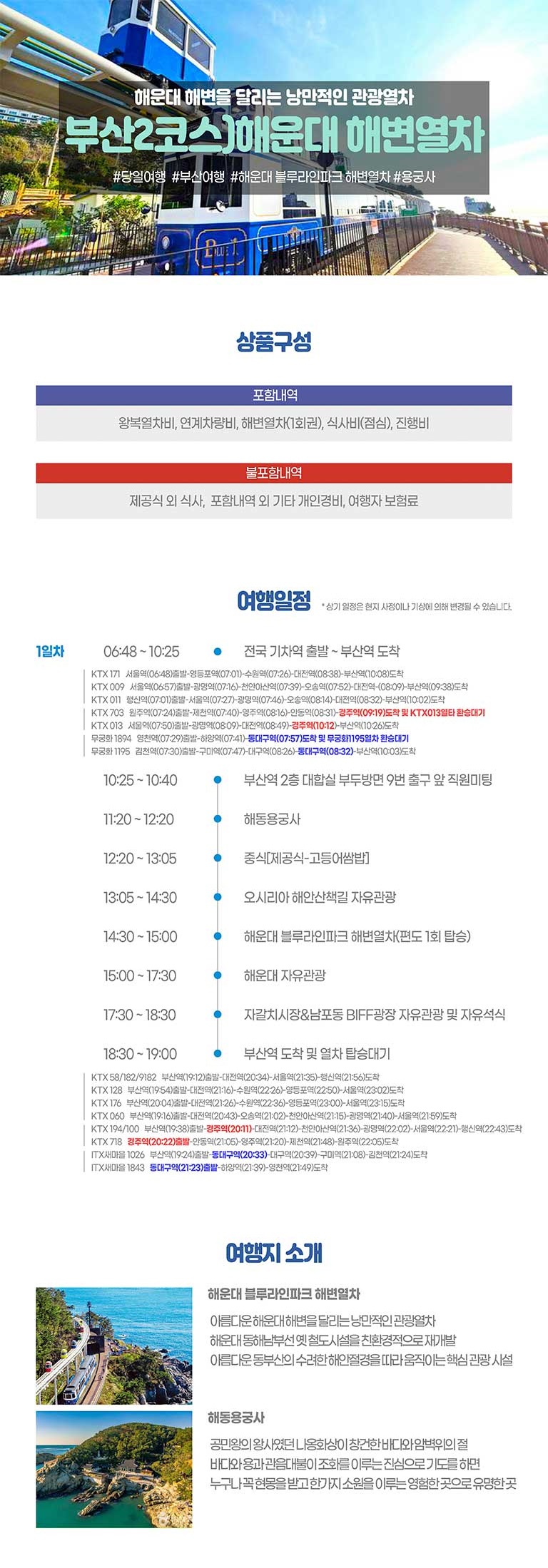 | 여행코스 | 부산역-해동용궁사-중식-아난티코브-해변열차-해운대-부산역 |