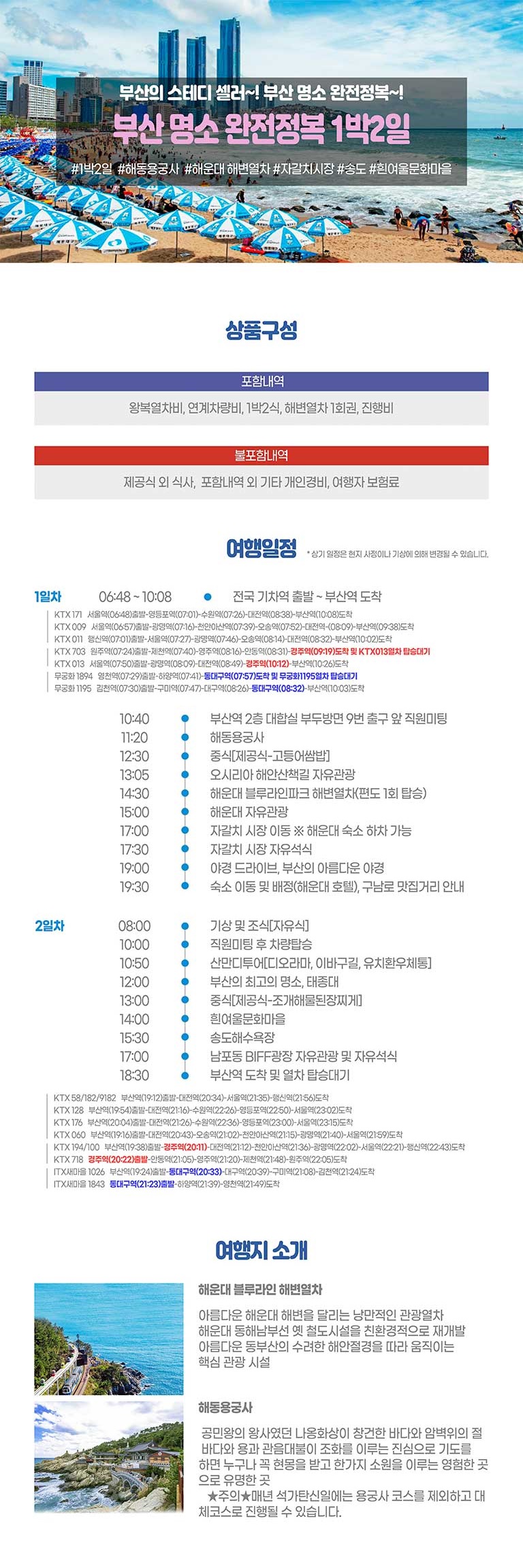 | 여행코스 | 부산역-해동용궁사-중식-아난티코브-해변열차-해운대-산만디투어-태종대(중식)-흰여울문화마을-송도해수욕장-자갈치시장-부산역 |