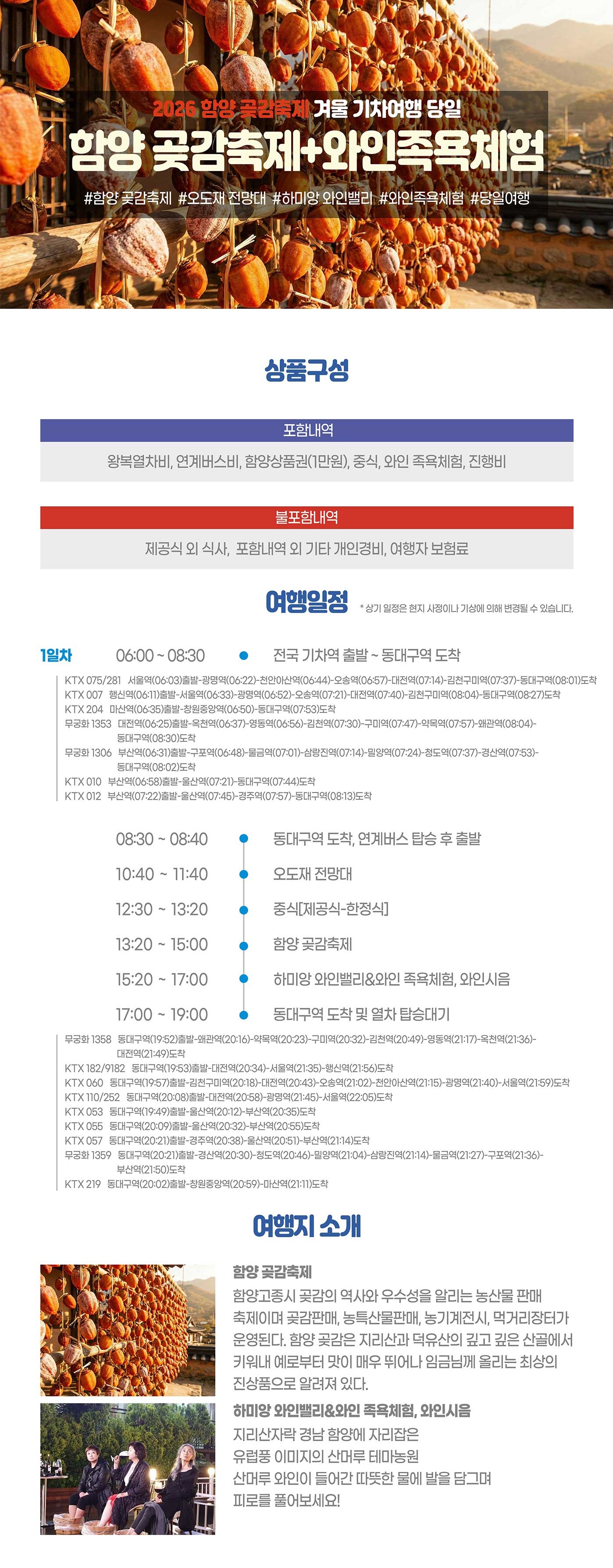 | 여행코스 | 동대구역-오도재 전망대-함양곶감축제-하미앙 와인밸리 와이너리투어-동대구역 |